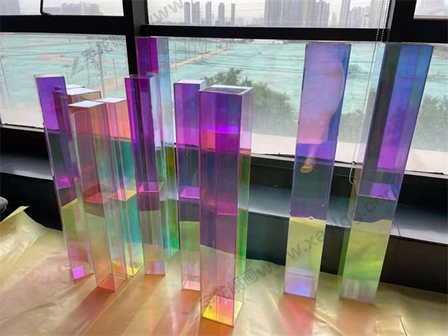 特點:彩虹膜的特點是亮度好,膜面均勻如鏡面效果,耐高溫,加工充分利用光干涉原理,在光線照射下,各層次間的折射和干涉使層次間多角度層式色澤變化,如同天空彩虹般效果。